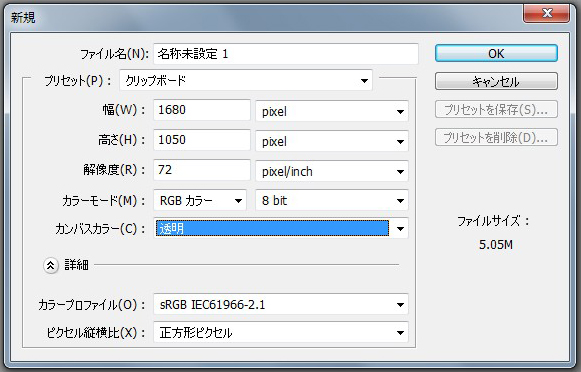 まず、新規ファイルを作成します。カンバスカラーは「透明」を選択します。