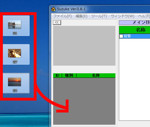 メインウィンドウの「背景」の上に1番目の画像を入れます。