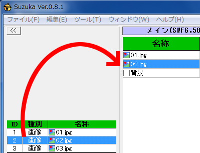 メインウィンドウの「01.jpg」と「背景」の間に2番目の画像を入れます。