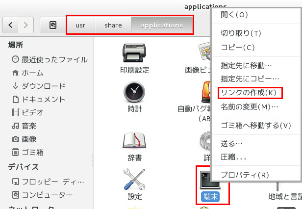 「usr」→「share」→「applications」をクリックし、「端末」や「Firefox」など