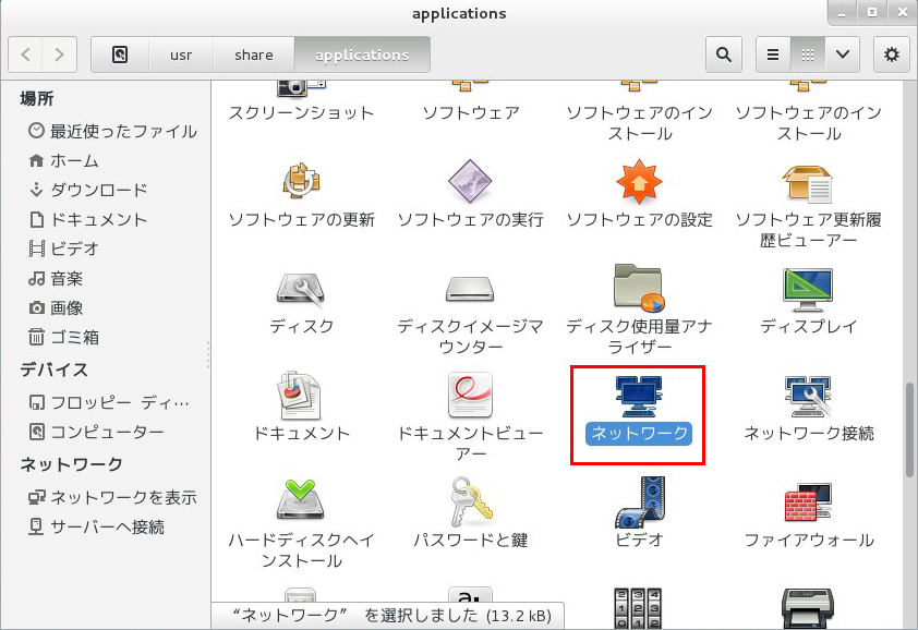 「usr」→「share」→「applications」→「ネットワーク」をクリックします。