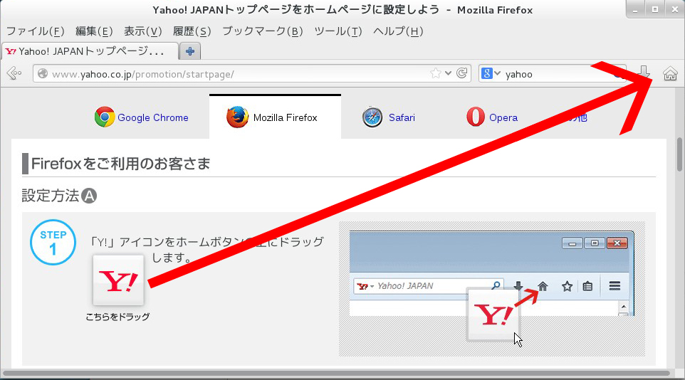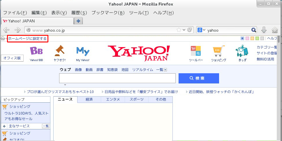 FirefoxでYahoo!へアクセスし「ホームページに設定する」をクリックします。