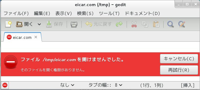 /tmpディレクトリのeicar.comを開きました。 「ファイル/tmp/eicar.comを開けませんでした。 そのファイルを開く権限がありません。」と表示されました。