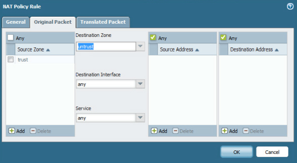 「元のパケット」にて送信元ゾーン、宛先ゾーンなどを入力します。