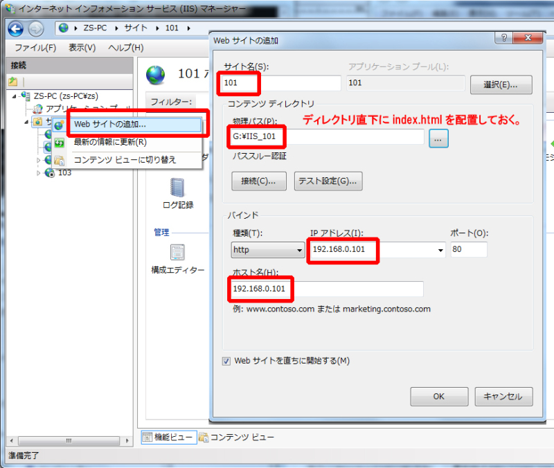 ※WindowsXPのIIS6では単一のサイトしか持てなかったかもしれません。