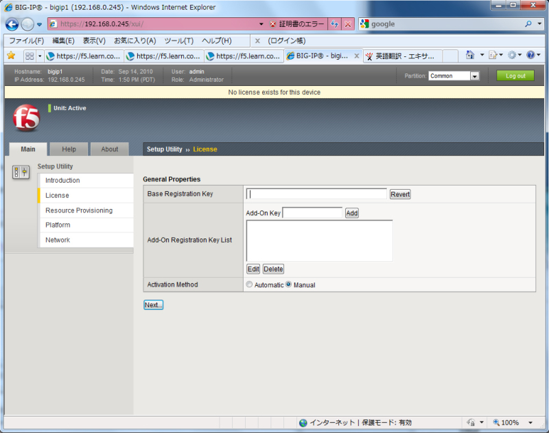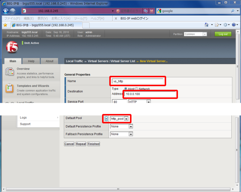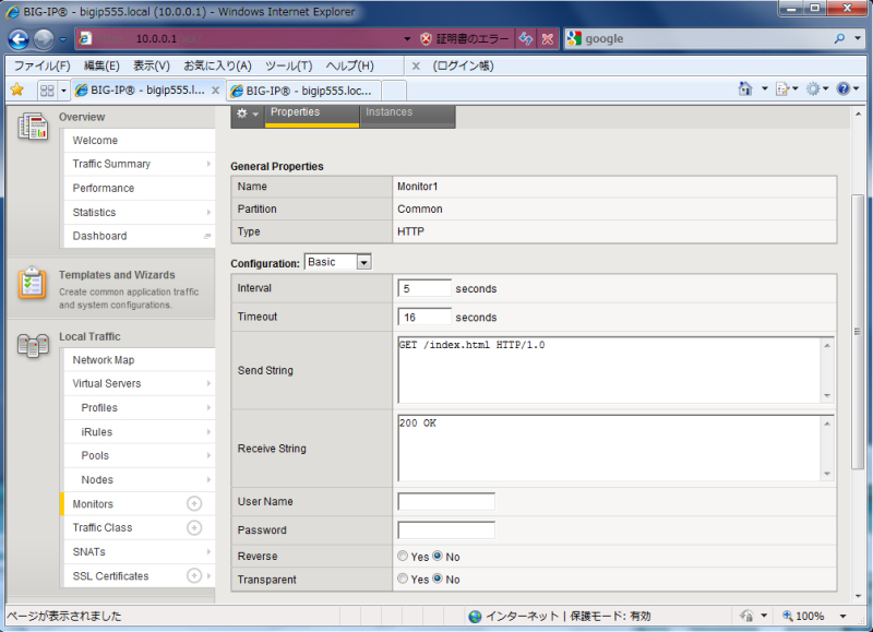 最初に設定した方のBIG-IP(UnitID 1)へwebログインします。