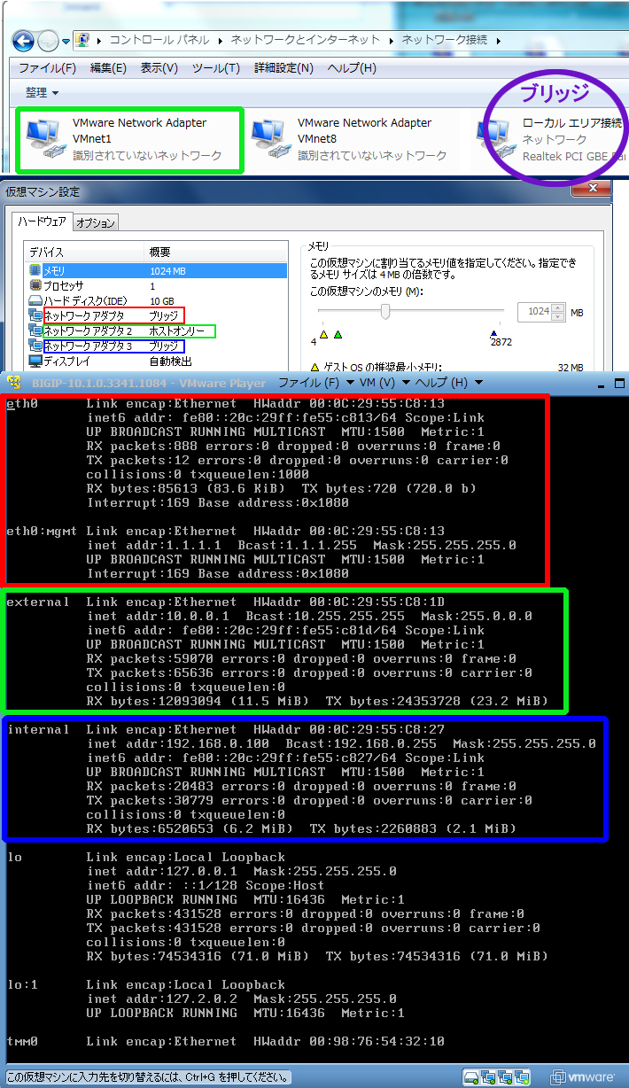 ※eth0:mgmtとeth0は、VMWareの設定では「ネットワークアダプタ」です。