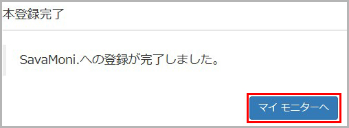 「本登録完了」画面が表示されました。「マイモニターへ」をクリックします。
