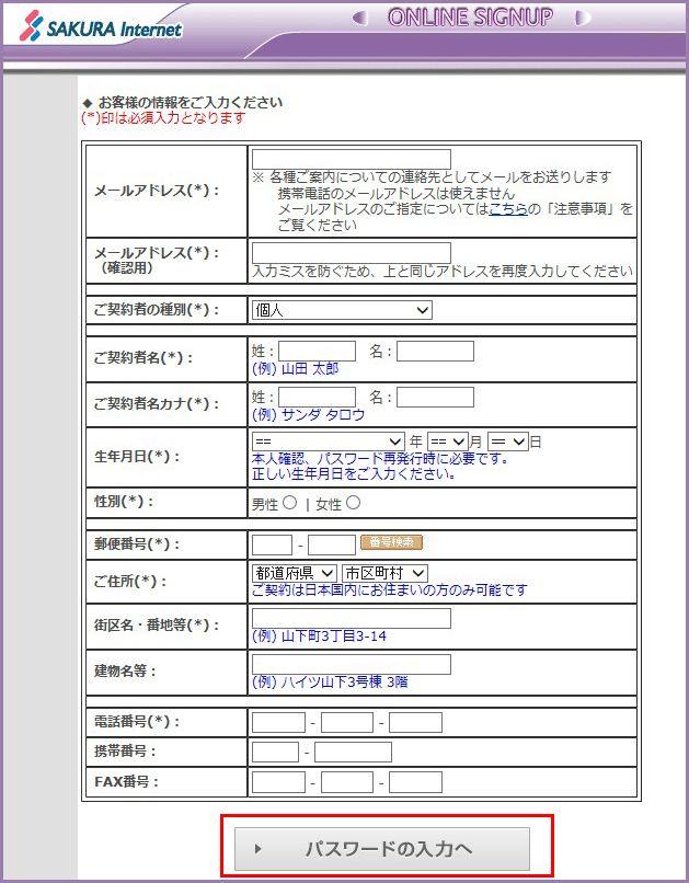 必要事項を記入し、「パスワードの入力へ」をクリックします。