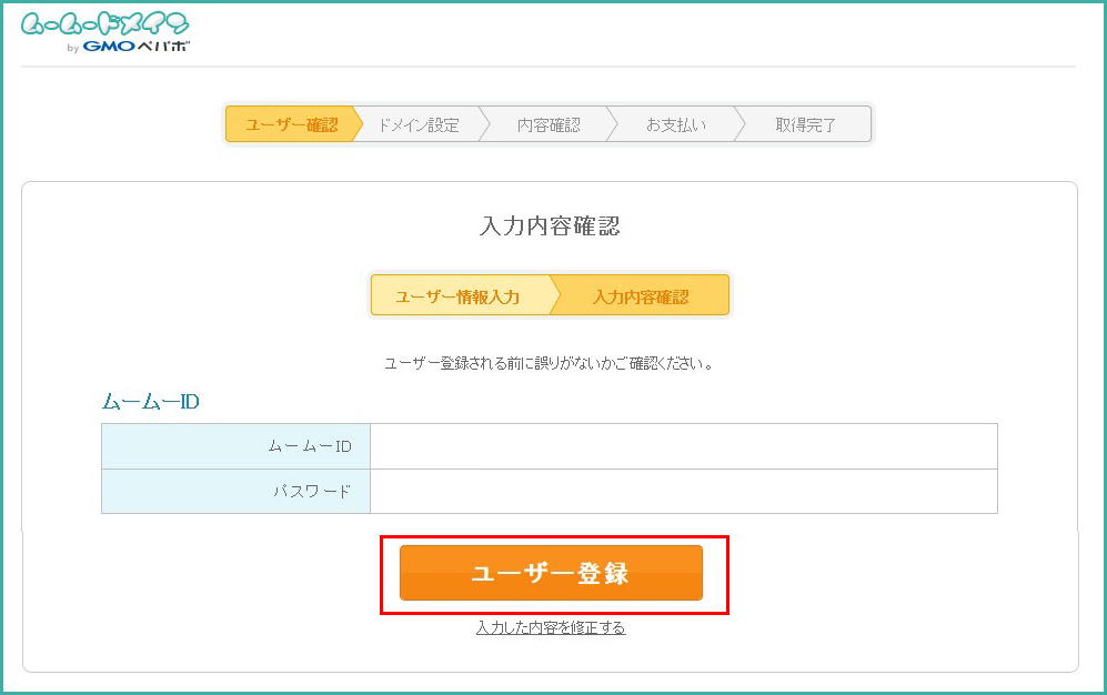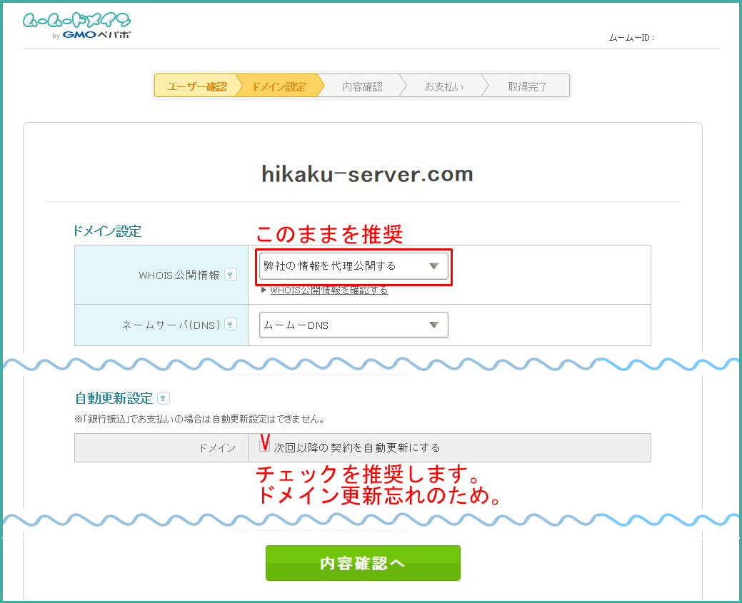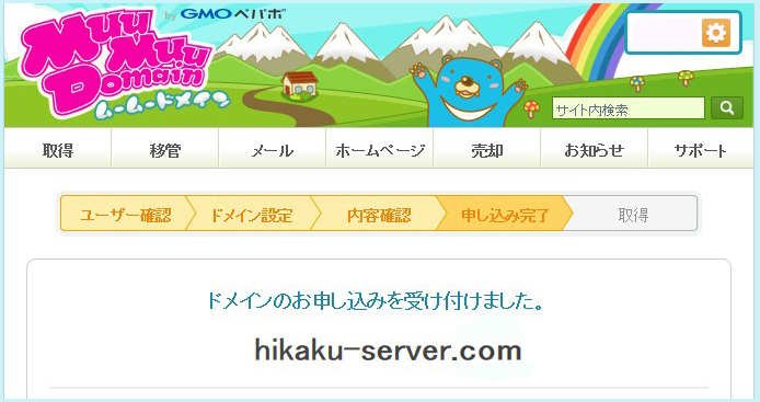 「ドメインのお申し込みを受け付けました」との表示を確認します。