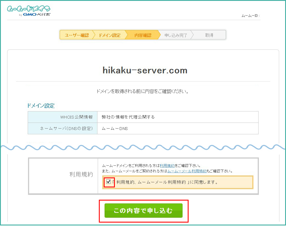 利用規約の同意にチェックを入れ「この内容で申し込む」をクリックします。
