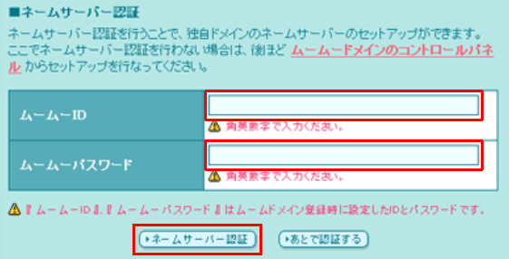 ムームーIDとムームーパスワードを入力し、「ネームサーバー認証」をクリックします。