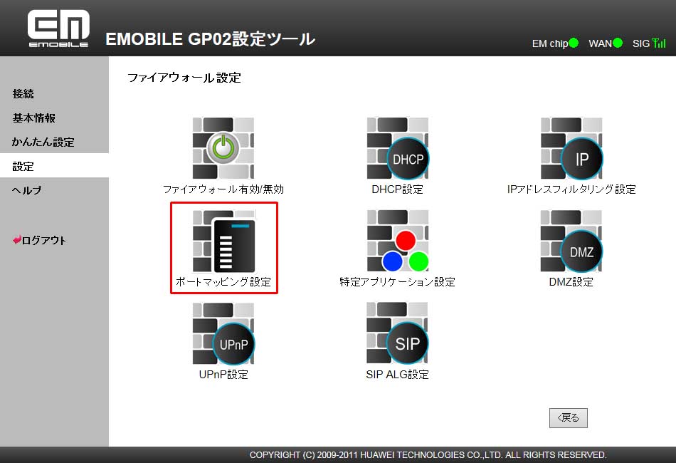 ワイモバイル(イーモバイル)のポケットWi-Fi、GP02の画面です。
