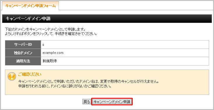 次に、ドメイン名が問題無ければ「キャンペーンドメイン申請」をクリックします。