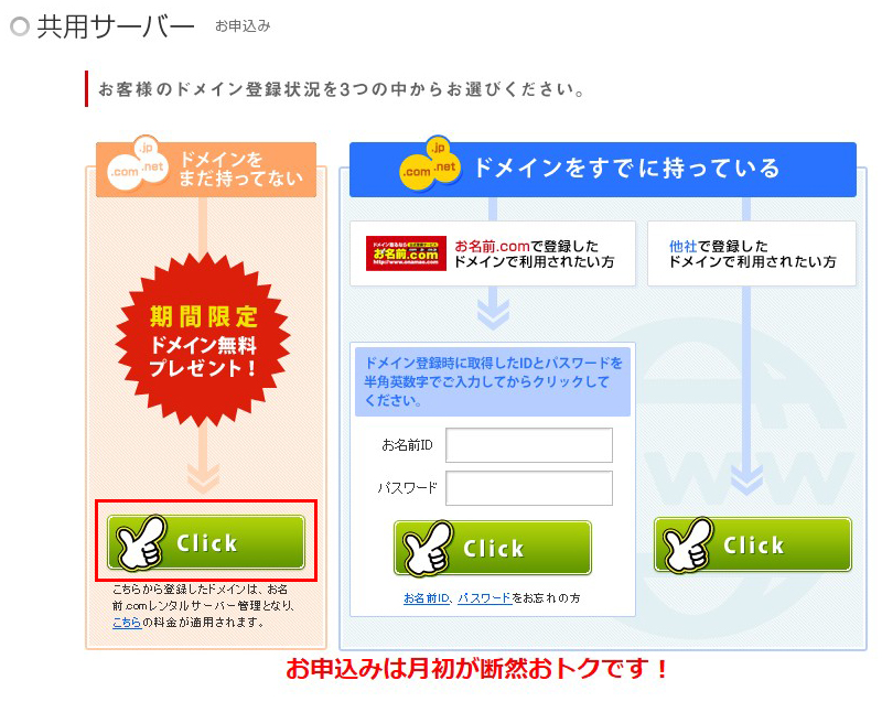「ドメインをまだ持っていない」の「Click」をクリックします。
