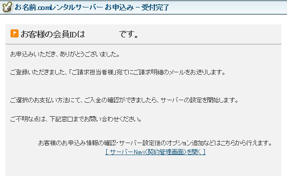 申し込みが完了しました。「サーバーNavi(契約管理画面)を開く」をクリックすると