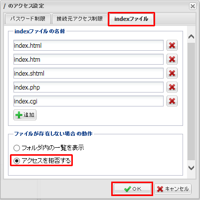 「indexファイル」をクリックし、「アクセスを拒否する」を選択し