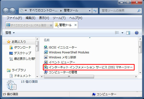 コントロールパネルの「管理ツール」→「インターネットインフォメーションサービス」