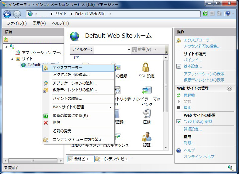 Default Web Siteを右クリックし「エクスプローラー」をクリックします。