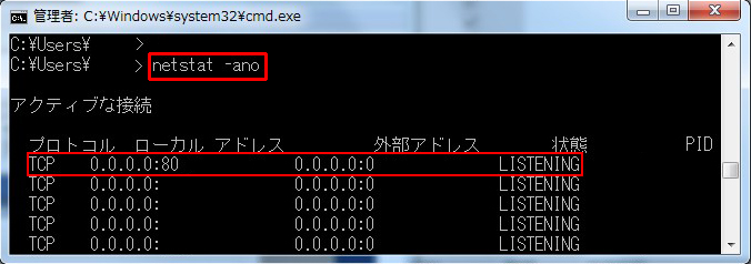 コマンドプロンプトで「netstat -ano」と入力すると正しく