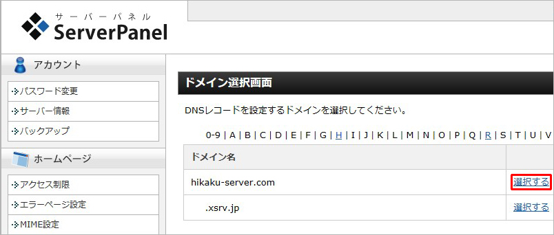 まず、サーバパネルにログインし、レコードを追加するドメイン名を選択します。