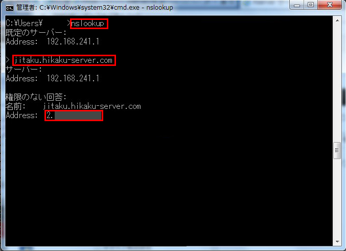 nslookupで確認すると、正しく設定出来ていることが分かりました。