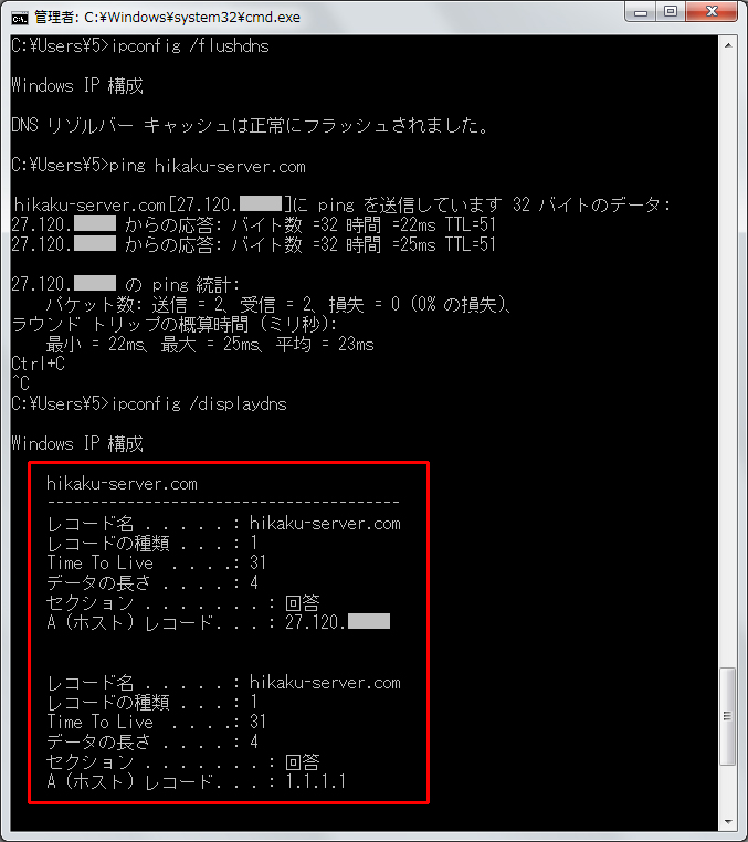 とし、パソコン(リゾルバ)のコマンドプロンプトでipconfig /flushdnsでDNSキャッシュを