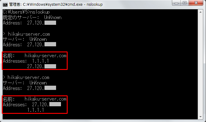 nslookupで確認すると、正しく2つのIPアドレスが返答されました。