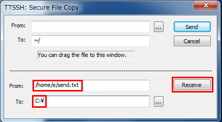To:に受信する側のWindowsのフォルダを指定し「Receive」をクリックします。