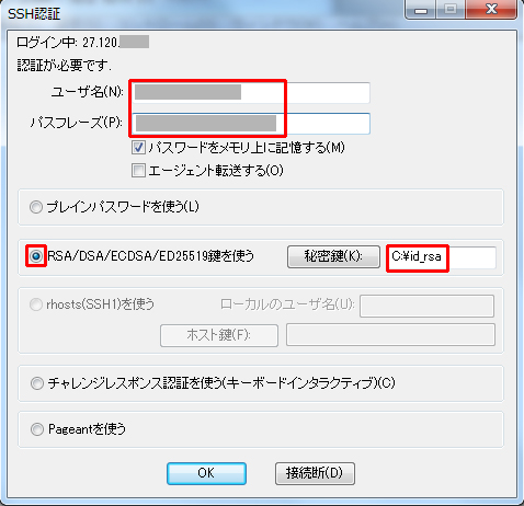 キーを作成したユーザー名、作成した際のパスフレーズ、RSA鍵の場所を
