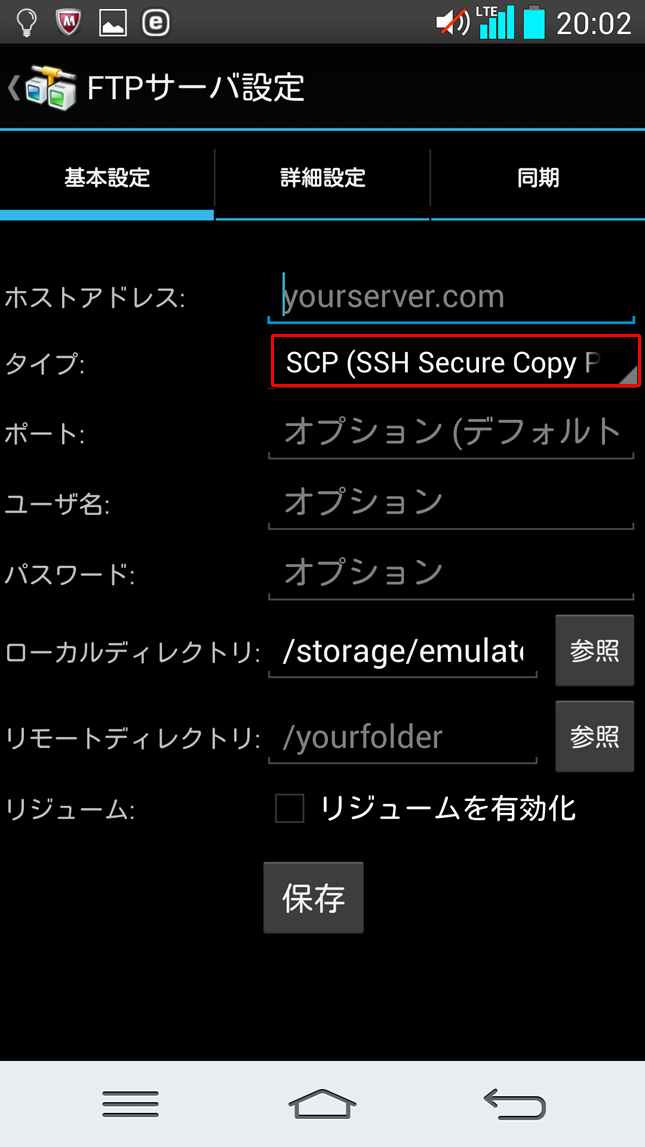 SSHの接続情報を入力します。タイプは「SCP」を選択します。