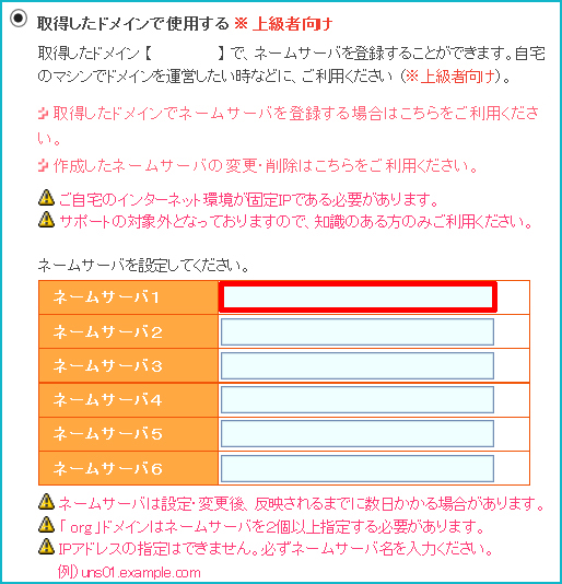 「取得したドメインで使用する 上級者向け」項目で、ネームサーバ1を設定します。