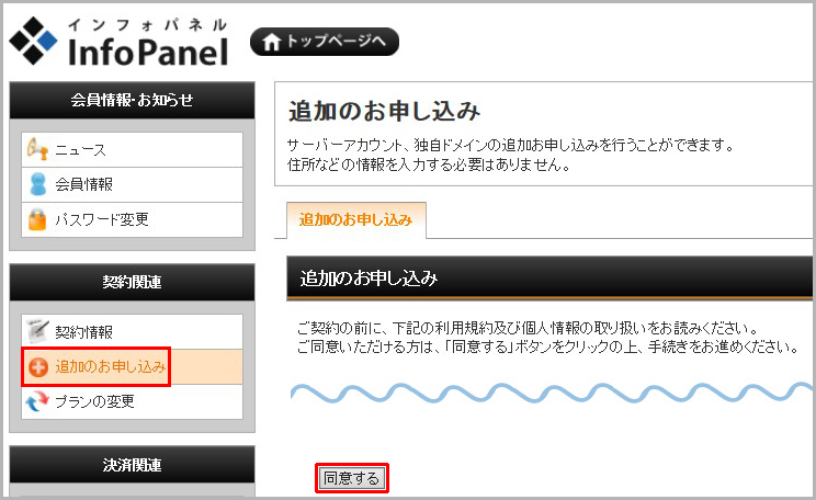 SNI SSL証明を取得するため、インフォパネルの「追加のお申し込み」をクリックします。