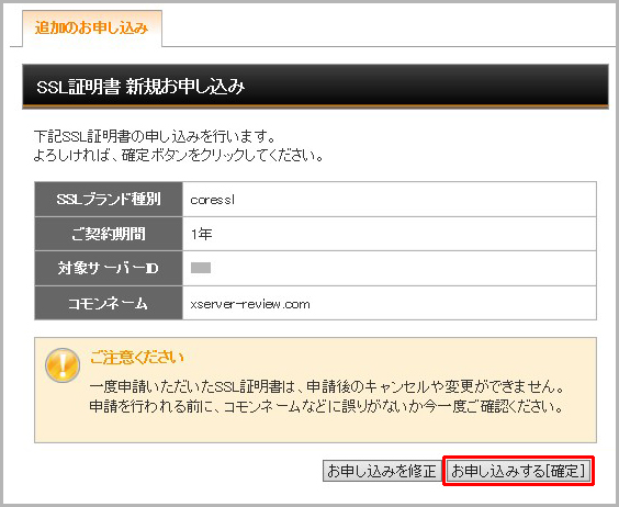 情報に問題が無ければ「お申し込みする[確定]」をクリックします。