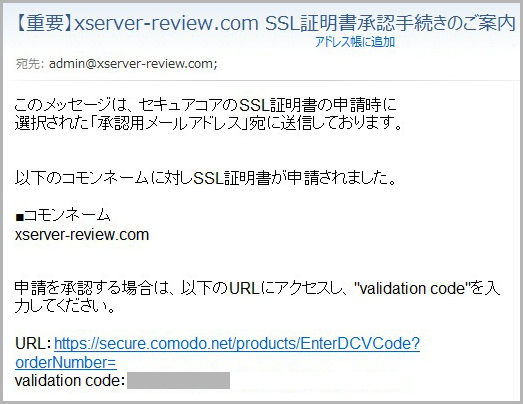 SSL証明書承認手続きのご案内」とのメールを受信しました。