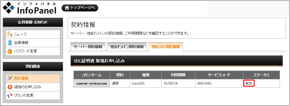 インフォパネルの「契約情報」ではSSL証明書のステータスが「有効」となっていました。